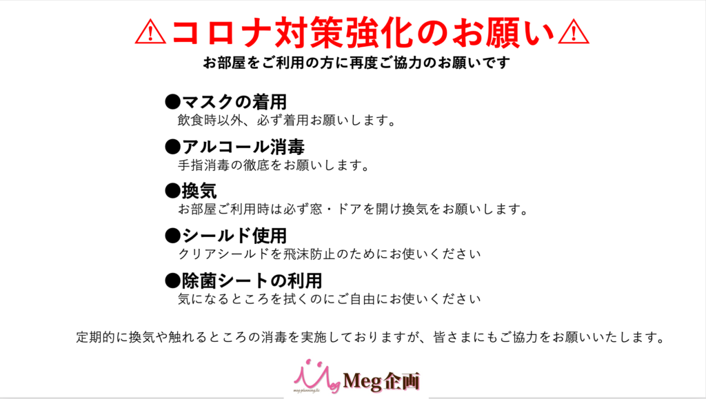 コロナ対策強化中ですby Meg企画on 投稿日: 2021年4月26日2021年9月9日 3度目の緊急事態宣言を受け、改めてのご協力のお願いです。 今までも皆さまにご協力いただいておりましたが、さらに徹底した対策をしていきたいと存じます。 よろしくお願いいたします。